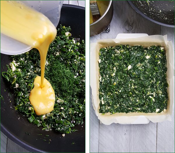 Wat voor een spinazie je ook gebruikt om de spanakopita te maken, het is van belang om deze goed uit te laten lekken. Anders wordt de taart veel te nat, waardoor de onderkant en de zijkant niet knapperig wordt. Na het uitlekken van 800 gram verse spinazie had ik ongeveer 250 ml vocht overgehouden.